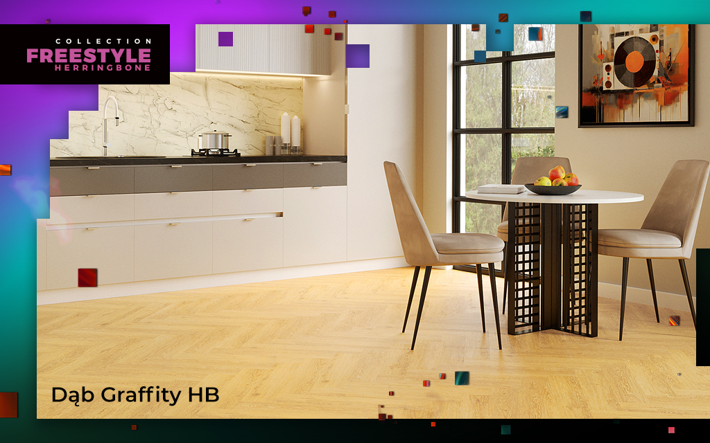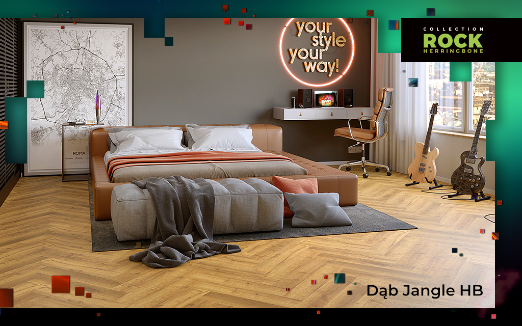 Nowe dekory doskonale wpisują się w tę ideę. Dąb Jangle HB wprowadza do oferty mocniejszy, bardziej wyrazisty charakter, inspirowany energią muzyki rockowej. Z kolei Dąb Grafitty HB stawia na harmonię i domowe ciepło, oferując spokojniejszą, elegancką interpretację klasycznej jodełki. Dwa nowe dekory uzupełniają dotychczasową paletę wzorów, dając jeszcze więcej możliwości tworzenia spójnych i stylowych aranżacji.