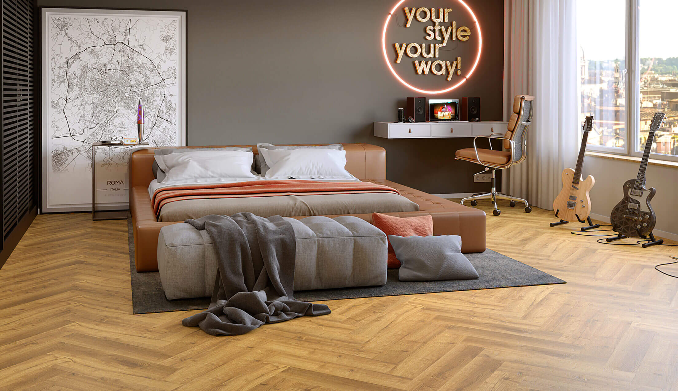 Jangle OAK HB captivates with its warm, golden-honey tones inspired by natural oak. Distinctive grain, subtle knots and delicate cracks give the surface an authentic character, making the floor look extremely realistic and elegant. The harmonious tonal variation between the planks gives the herringbone pattern depth and natural dynamism. This decor warms up the interior, brightens the space and creates a cosy atmosphere – regardless of the style of the interior design.